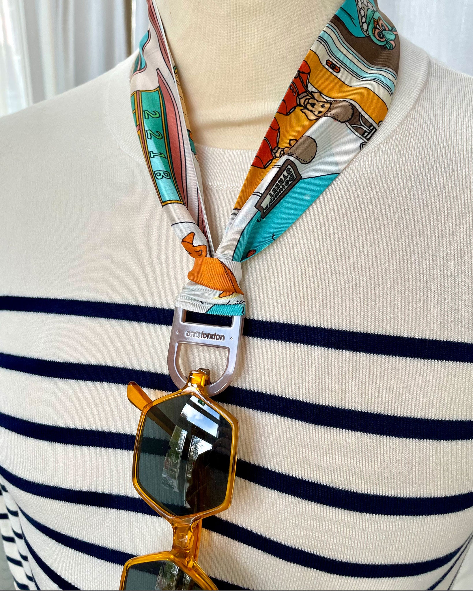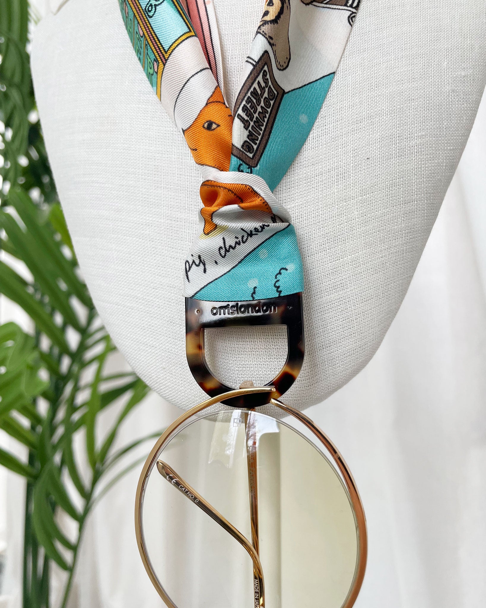 Crafted from sustainable bio-acetate material, this scarf ring features a double D shape, making your scarf wearing effortless and playful. Get creative and achieve a one-of-a-kind look! You can even convert your twilly into a glasses holder! How fun!