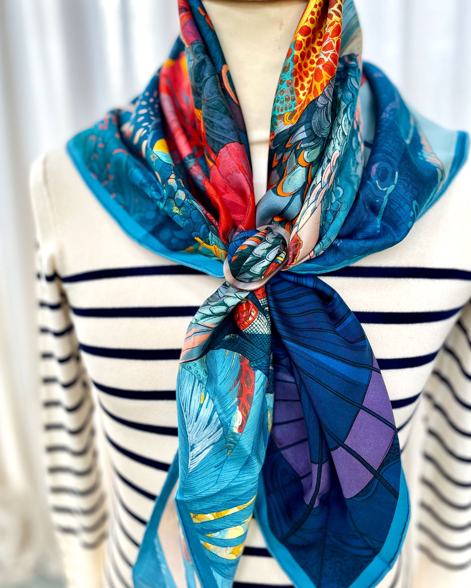 - The ring could be used in multiple ways with different sizes of scarf. The beautiful scarves used in photo shootings are twilly, 55cmx55cm, and 90cmx90cm. All from our lovely friends Pig, Chicken, Cow