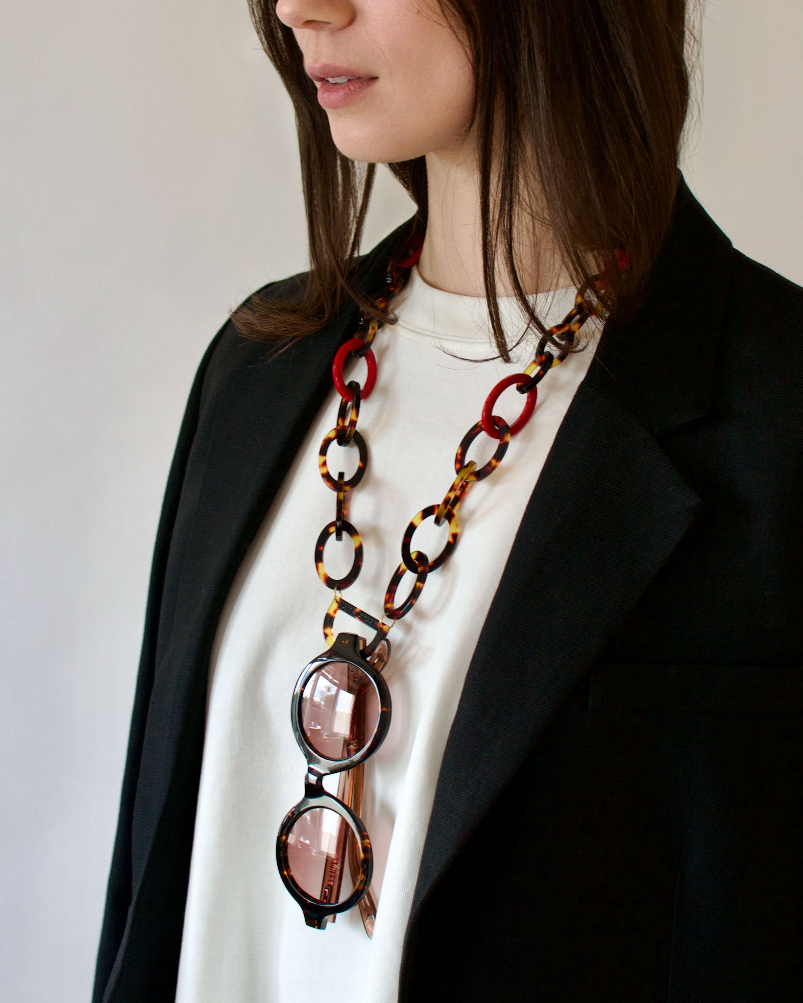 Original D Glasses Necklace is a stylish alternative to ordinary glasses chains and spectacle holders. It is composed of bold hoops made of Italian acetate, joining at the signature ‘D’ shape, creating a beautiful necklace that holds your glasses. You can wear it alone as a necklace, or hang your reading glasses, sunglasses or optical glasses on it.