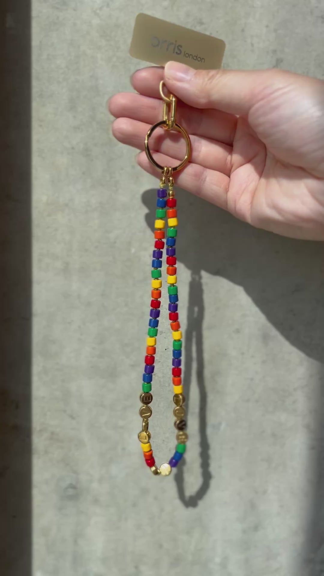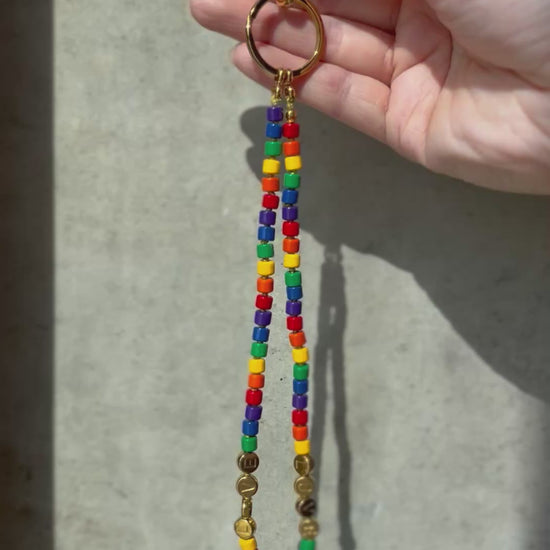 This hand-knotted phone strap features glossy enamel beads in the six rainbow colours, strung on a golden cord for a radiant, celebratory finish. Accented with gold-plated stainless steel beads engraved with Love is Love, it’s a tactile reminder of connection, care, and identity.