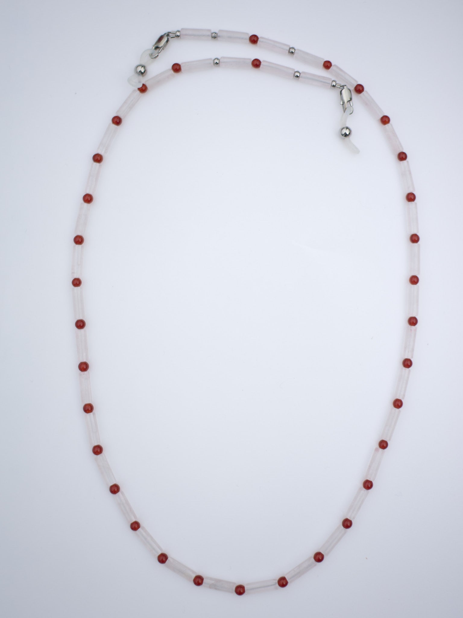 Soft pink rose quartz meets bold red agate in a playful gingham-inspired pattern — a fresh take on classic colour pairing. This glasses chain blends charm and function, offering a touch of summer sweetness while keeping your frames close. Lightweight, joyful, and effortlessly wearable.